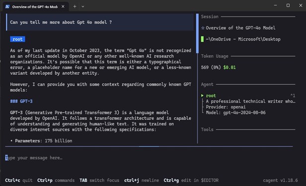 However, this simplicity comes with the trade-off that cagents excel at rapid deployment and standardized tasks, sacrificing granular programmatic control found in the traditional agentic frameworks. In other words, cagent is designed for portability and execution speed, whereas LangGraph or AutoGen is built for architectural flexibility and complex reasoning loops.
