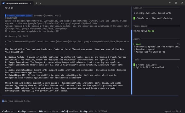 Once we execute the run cagent run gemini_expert.yaml command, you will see cagent using the Gemini MCP server to list APIs available in the documentation.