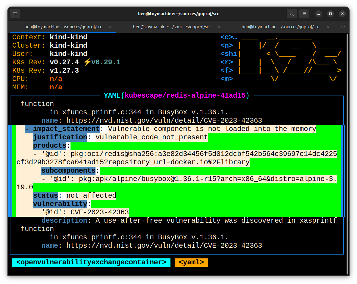 The Kubescape Operator produces VEX documents and stores them as Kubernetes API objects. These VEX documents categorize vulnerabilities as “affected” or “not affected” based on their reachability to enable IT teams to better prioritize remediation efforts.
