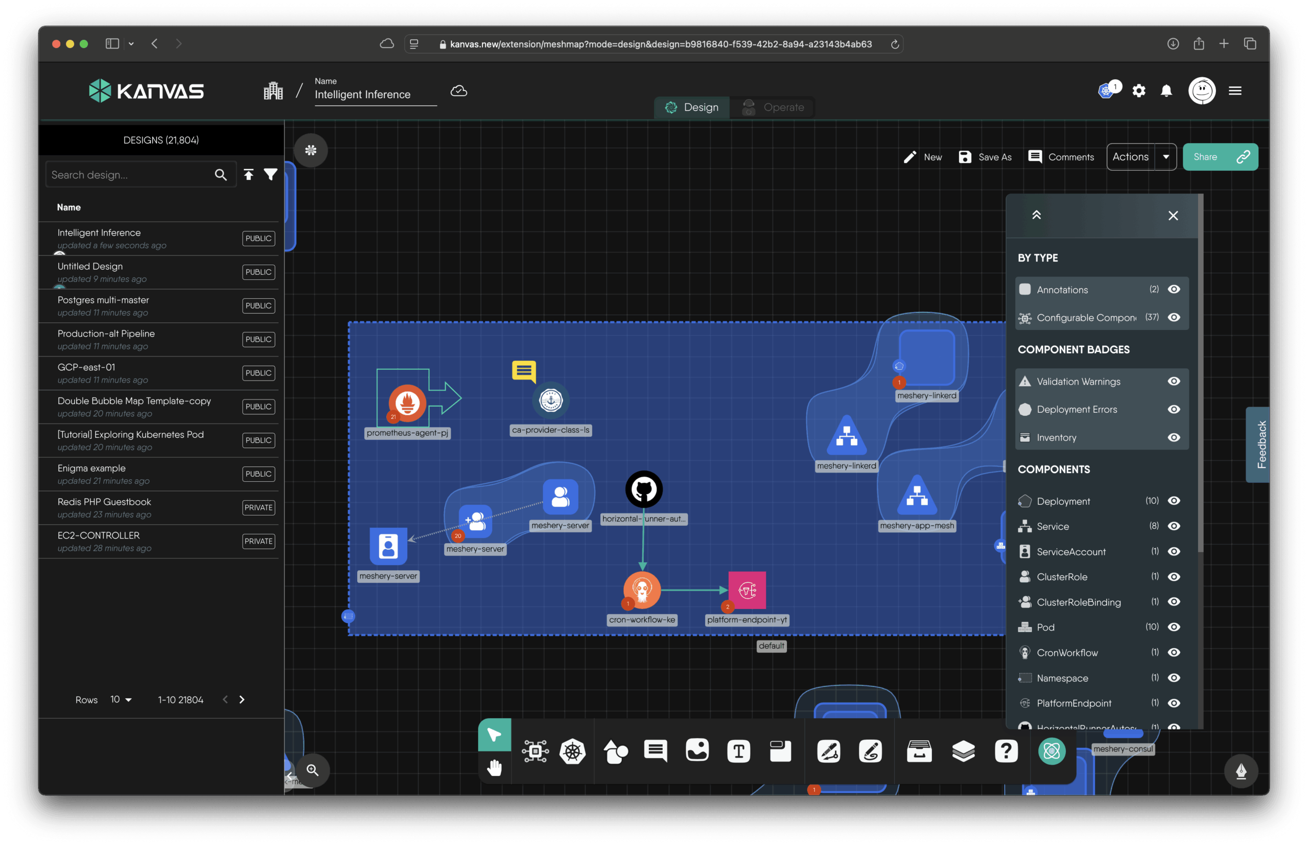 Available to be deployed by an internal IT team or access as a managed service, Kanvas today provides a drag-and-drop interface for designing and visualizing complex infrastructure and application architectures using Meshery.