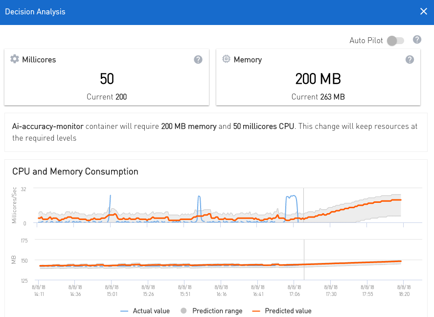 The first thing that came to mind to fix this particular issue was to use our own AI pipeline to get the future workloads predictions and estimated memory and CPU needs. We did some tweaks and started feeding in the CPU and memory metrics into our forecasting and decision-maker components. We were actually happy with the predictions being generated in a fairly short period. Our AI was able to predict memory and CPU needs for next two to four hours for each pod with 80 percent accuracy. This is based on recurring usage patterns we saw for CPU and memory—see snapshot below of predicted memory and CPU of one of our pods.