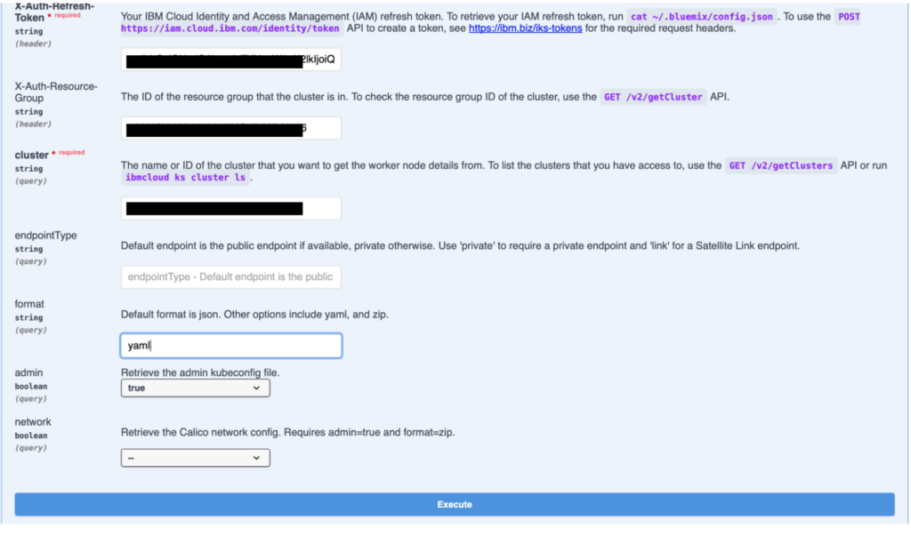 To execute this API and retrieve the admin configuration, you’ll require the Authorization Token, X-Auth-Refresh-Token, X-Auth-Resource-Group, and the cluster ID.