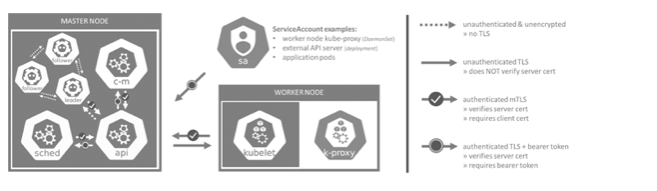 First, let’s discuss requests from worker node components to the API server. The authentication method of kube-proxy depends on the way it was installed on the worker node: